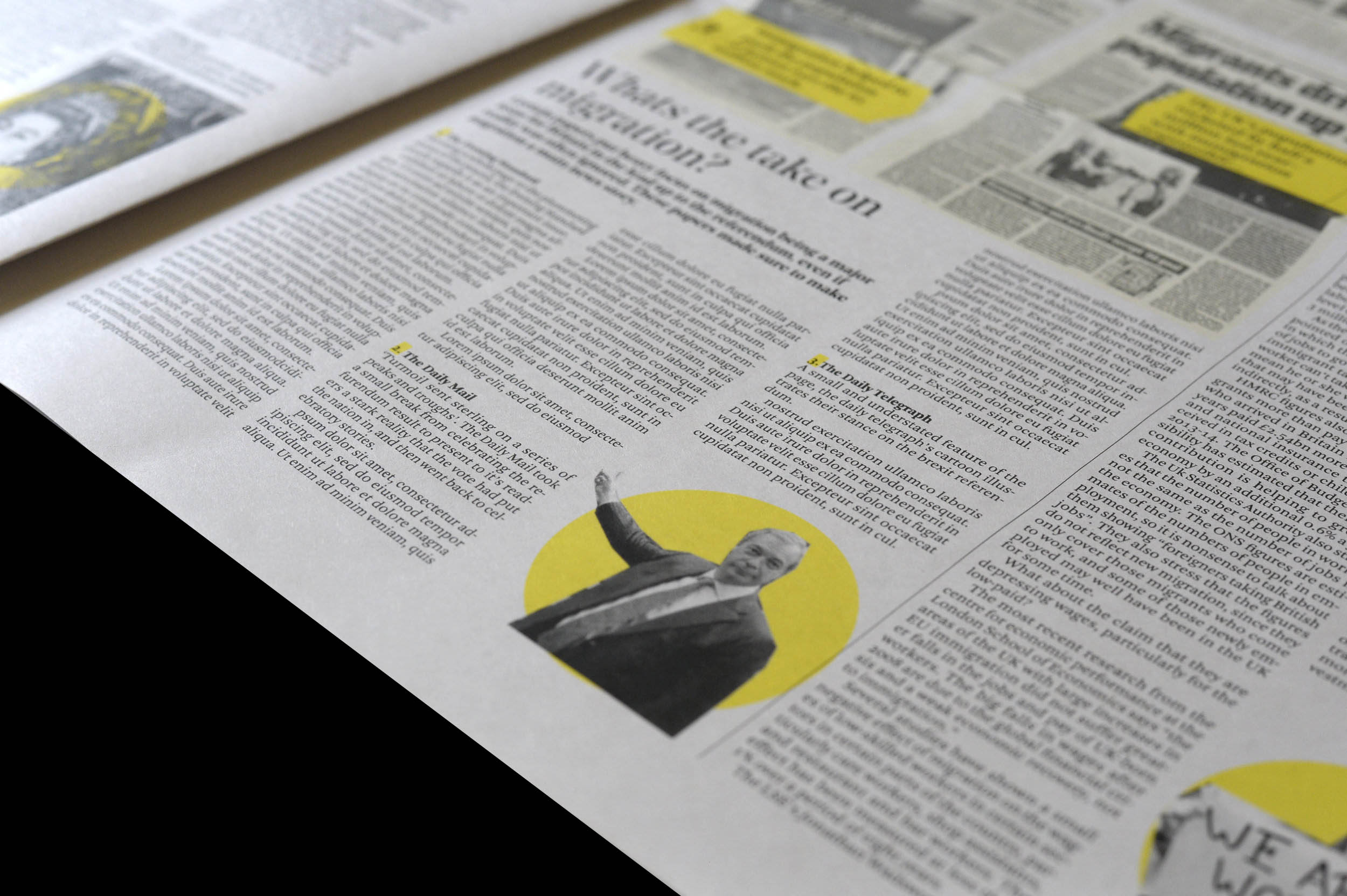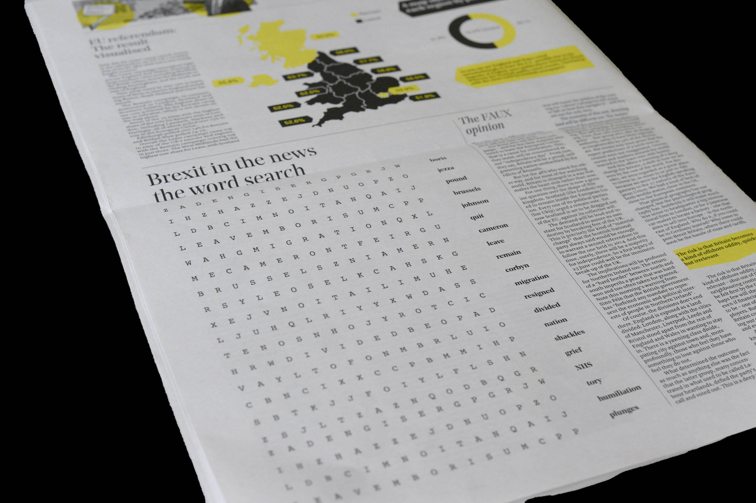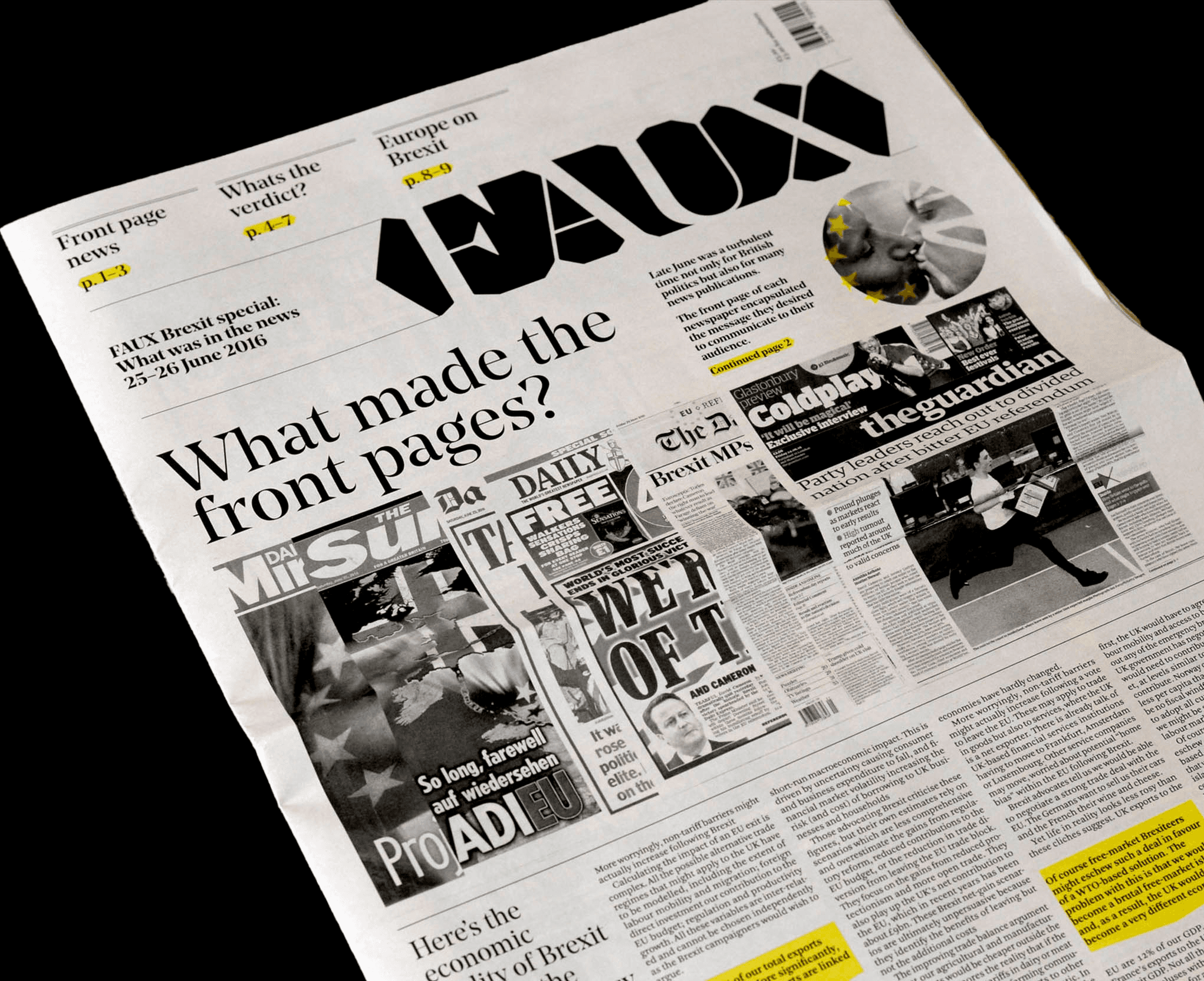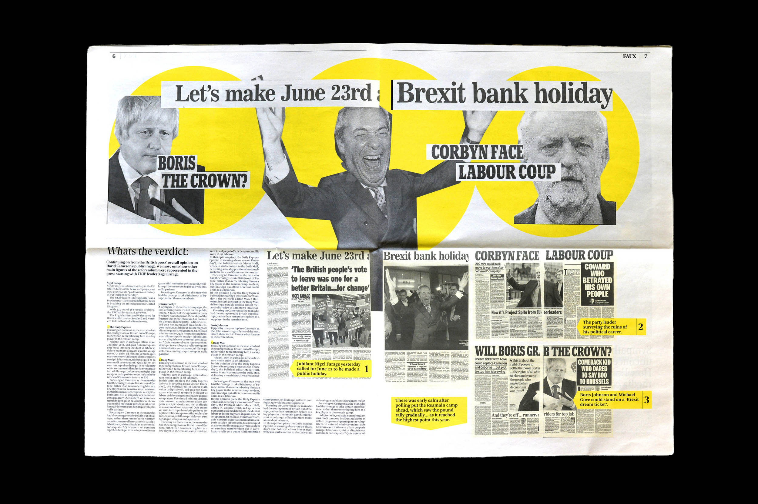 My newspaper concept aimed to provide commentary on news reporting, titled FAUX, a nod to its exploration of authenticity. I began with the masthead, opting for Noe Display in all caps to make a bold statement. Type hierarchy was then explored, determining sizes for headings, body text, and pull quotes, as well as their relationship with columns and images. A punk DIY aesthetic with authority guided design decisions. Utilizing a two-colour print and juxtaposing cut-out images with refined typography achieved this effectively. The paper was formatted in Berliner size to distinguish it from typical broadsheets and tabloids.