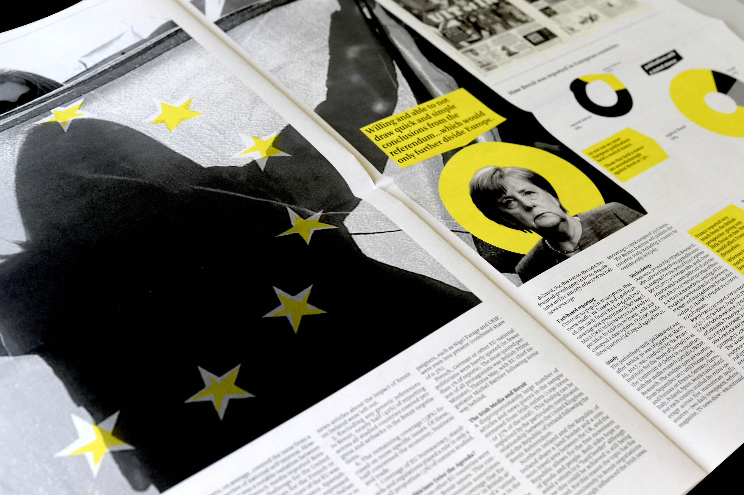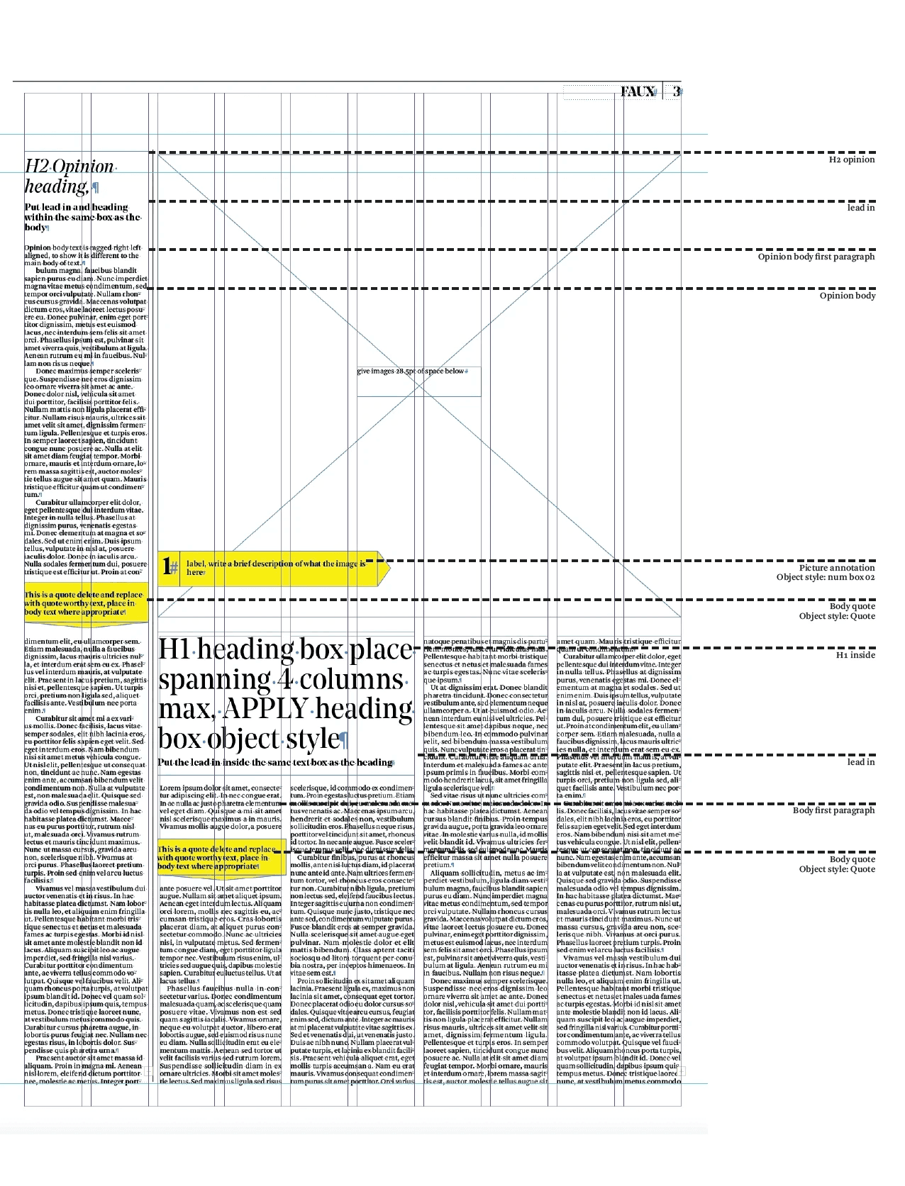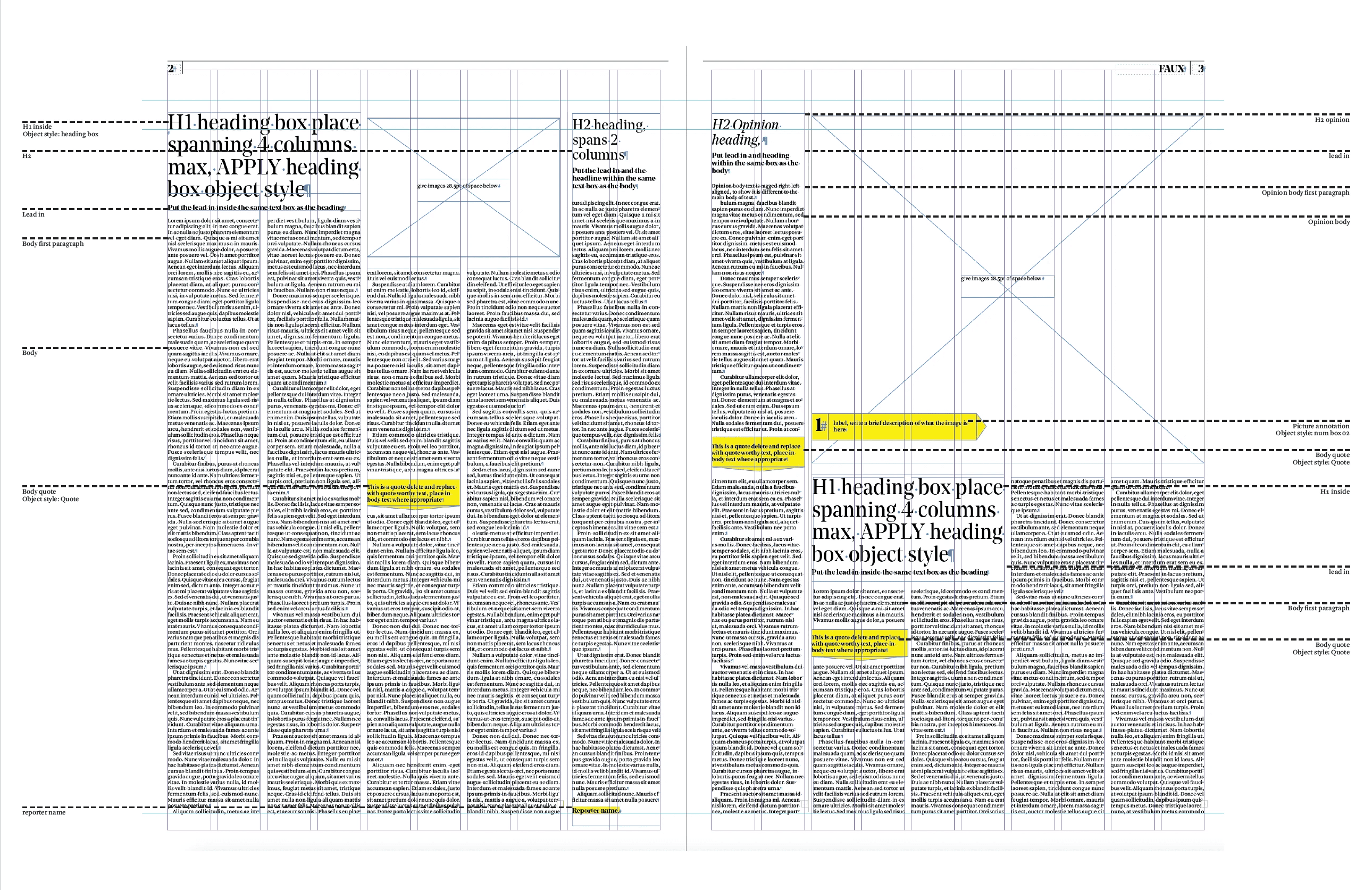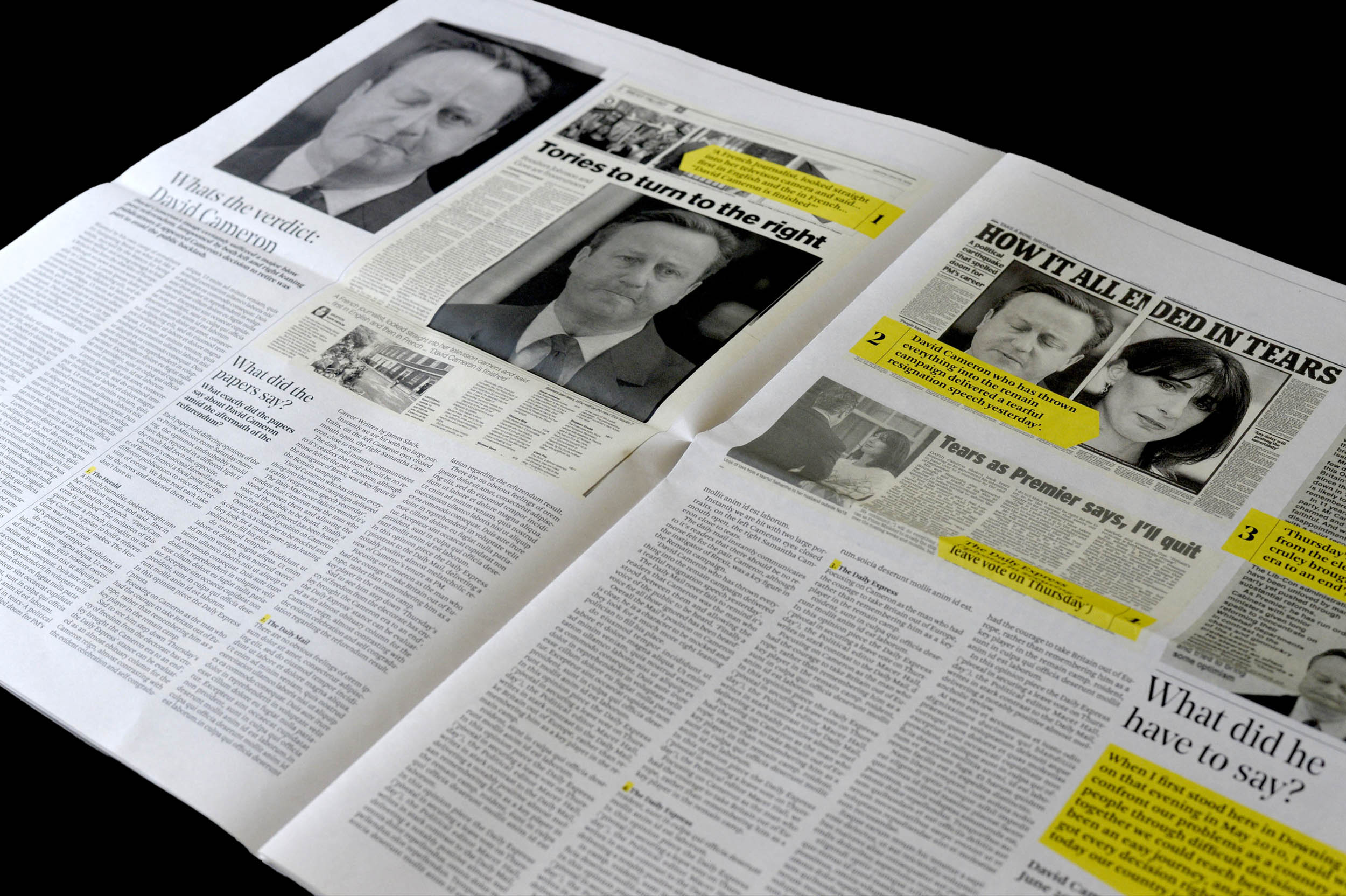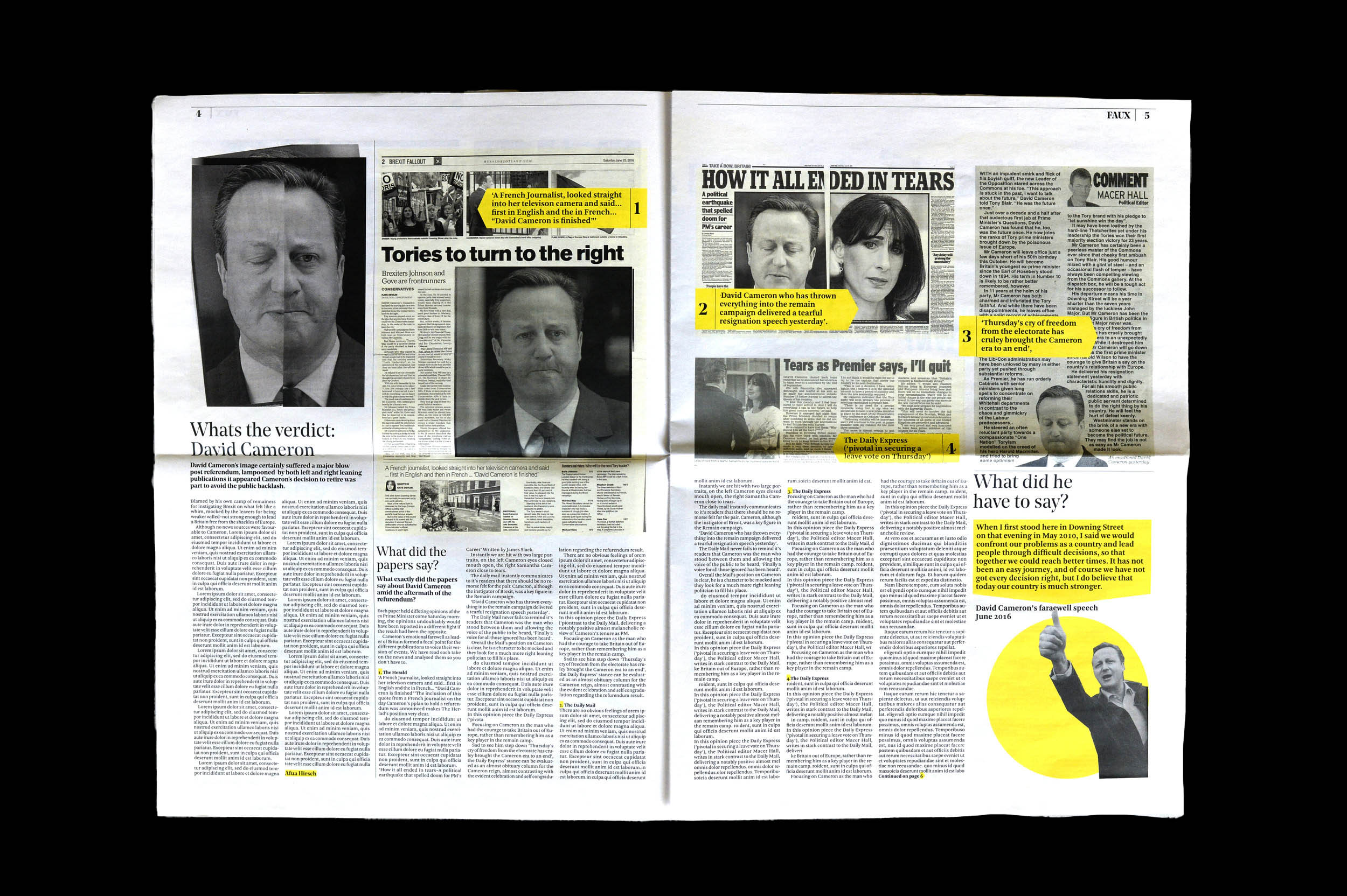 My newspaper concept aimed to provide commentary on news reporting, titled FAUX, a nod to its exploration of authenticity. I began with the masthead, opting for Noe Display in all caps to make a bold statement. Type hierarchy was then explored, determining sizes for headings, body text, and pull quotes, as well as their relationship with columns and images. A punk DIY aesthetic with authority guided design decisions. Utilizing a two-colour print and juxtaposing cut-out images with refined typography achieved this effectively. The paper was formatted in Berliner size to distinguish it from typical broadsheets and tabloids.