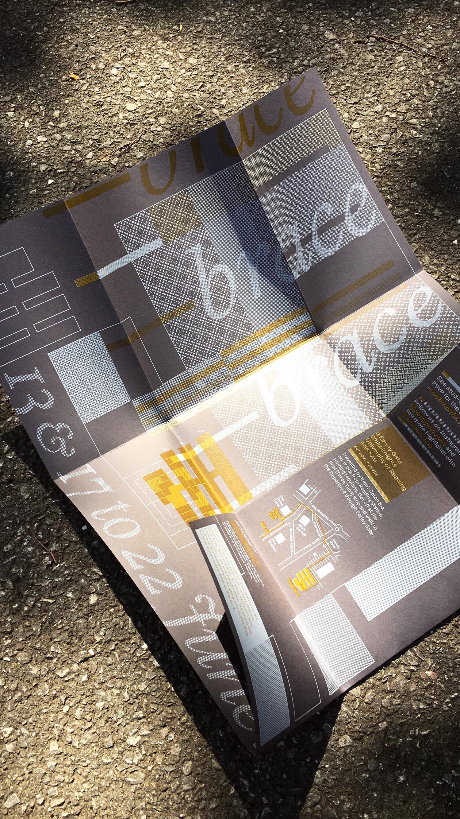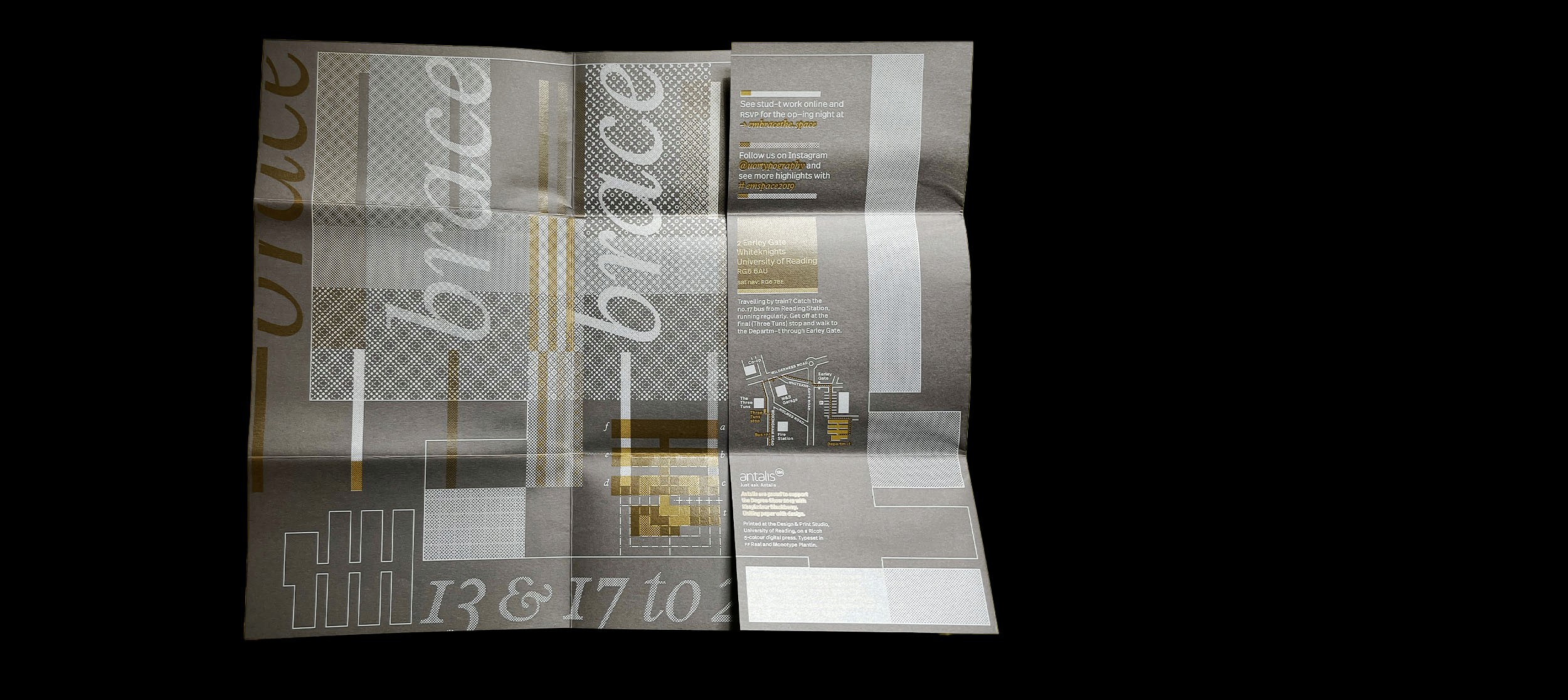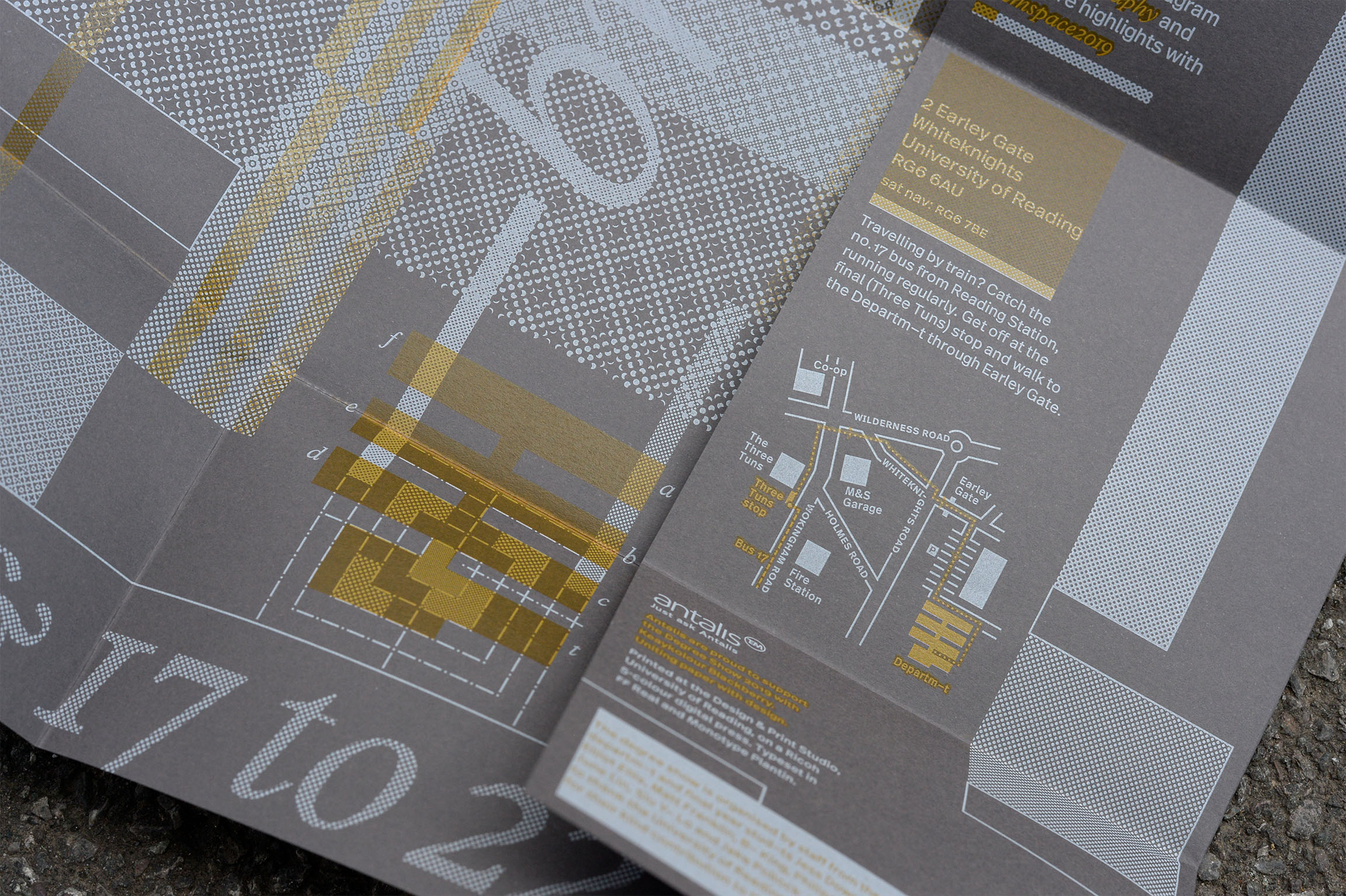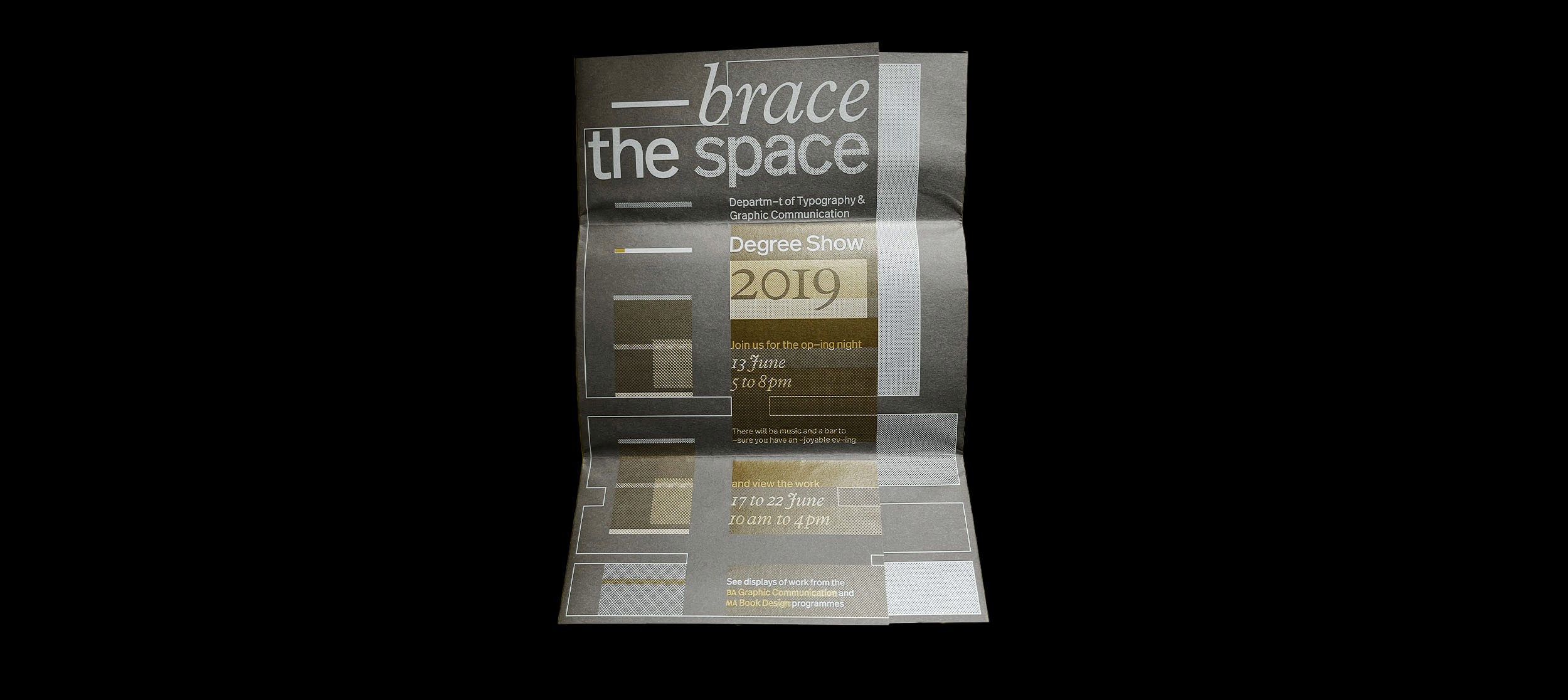 Each year the graduating class of the University of Reading's department of Typography & Graphic Communication has a degree show, the branding of which is determined by a group of students from that class. The team is responsible for the branding, designing and producing all the deliverables related to the final degree show for the graduating classes of 2019. The range of deliverables are chosen and rationalised by the team.