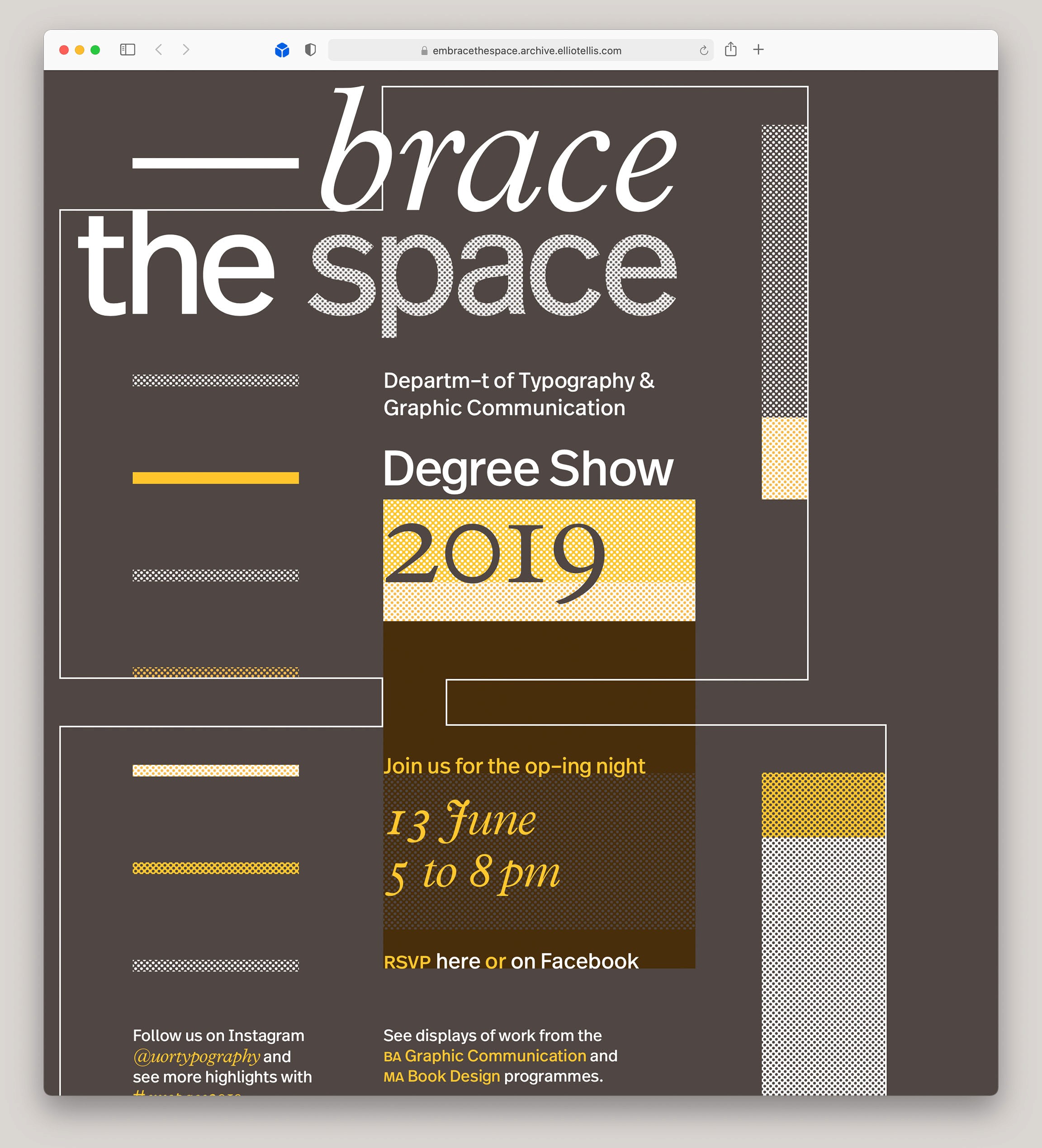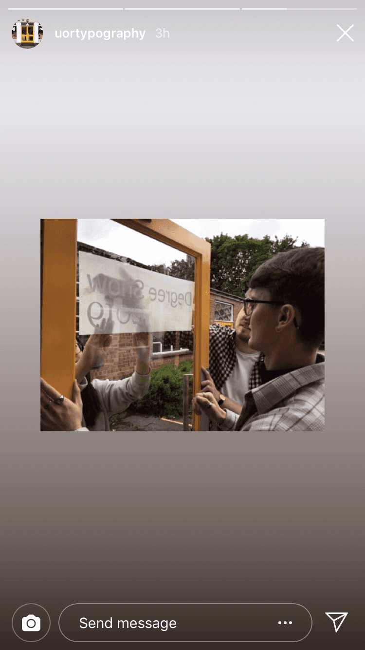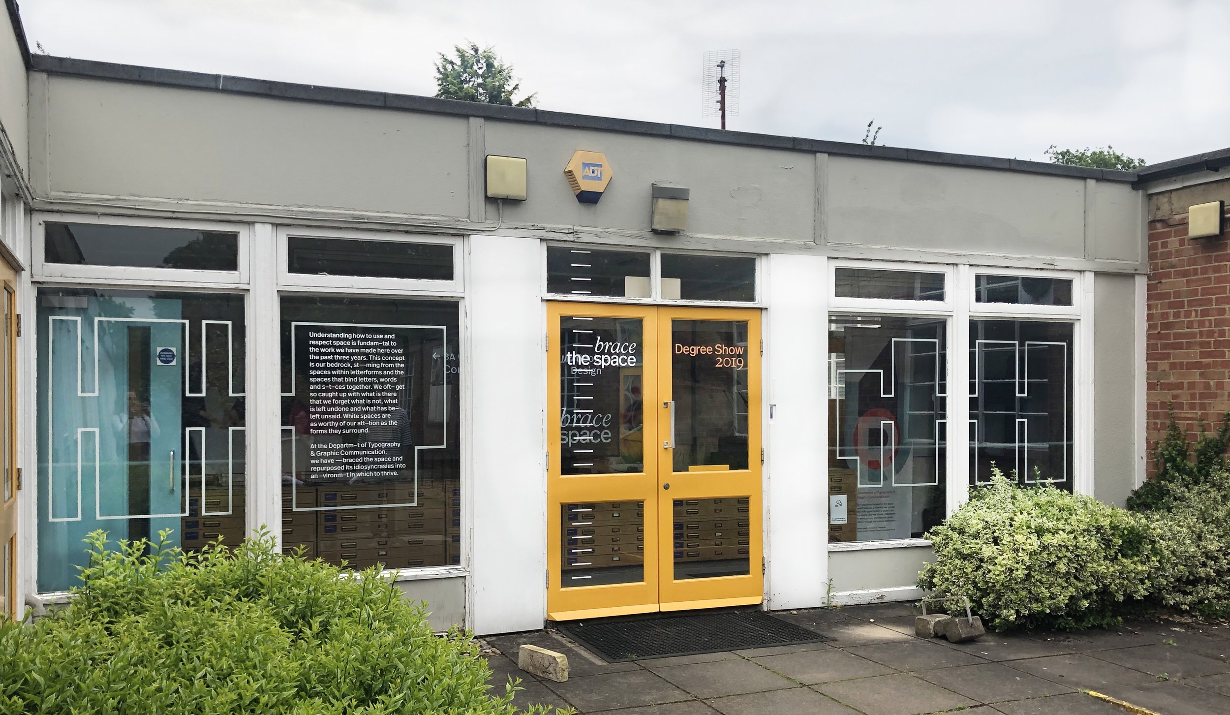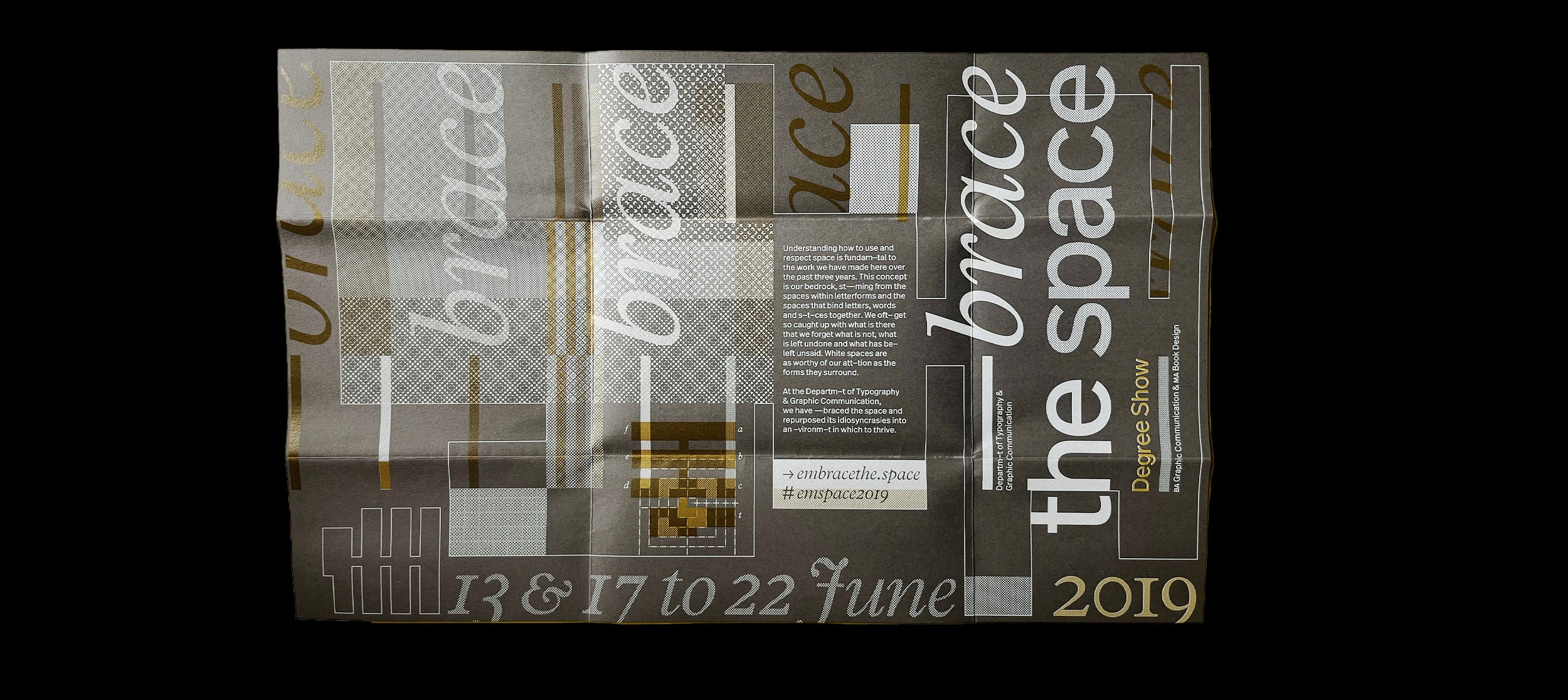 Each year the graduating class of the University of Reading's department of Typography & Graphic Communication has a degree show, the branding of which is determined by a group of students from that class. The team is responsible for the branding, designing and producing all the deliverables related to the final degree show for the graduating classes of 2019. The range of deliverables are chosen and rationalised by the team.